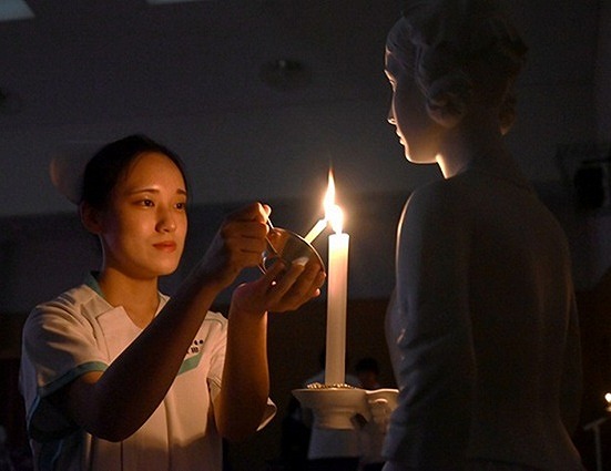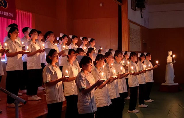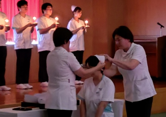 戴帽生は列席者が見守る中、ナイチンゲール像から看護の灯を受け継ぎ、幻想的な光の中で看護の道へ進む決意を新たに、自分たちで考えた『誓いの言葉』を述べました。